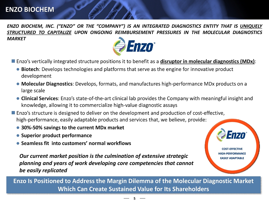 5 ENZO BIOCHEM ENZO BIOCHEM, INC . (“ENZO” OR THE “COMPANY”) IS AN INTEGRATED DIAGNOSTICS ENTITY THAT IS UNIQUELY STRUCTURED TO CAPITALIZE UPON ONGOING REIMBURSEMENT PRESSURES IN THE MOLECULAR DIAGNOSTICS MARKET Enzo’s vertically integrated structure positions it to benefit as a disruptor in molecular diagnostics (MDx) : Biotech : Develops technologies and platforms that serve as the engine for innovative product development Molecular Diagnostics : Develops, formats, and manufactures high - performance MDx products on a large scale Clinical Services : Enzo’s state - of - the - art clinical lab provides the Company with meaningful insight and knowledge, allowing it to commercialize high - value diagnostic assays Enzo’s structure is designed to deliver on the development and production of cost - effective, high - performance , easily adaptable products and services that, we believe, provide: 30% - 50 % savings to the current MDx market Superior product performance Seamless fit into customers’ normal workflows Enzo Is P ositioned to Address the Margin D ilemma of the Molecular Diagnostic Market W hich C an C reate S ustained Value for Its Shareholders Our current market position is the culmination of extensive strategic planning and years of work developing core competencies that cannot be easily replicated