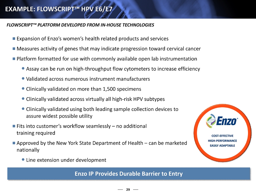 29 EXAMPLE: FLOWSCRIPT™ HPV E6/E7 FLOWSCRIPT™ PLATFORM DEVELOPED FROM IN - HOUSE TECHNOLOGIES Expansion of Enzo’s women’s health related products and services Measures activity of genes that may indicate progression toward cervical cancer Platform formatted for use with commonly available open lab instrumentation Assay can be run on high - throughput flow cytometers to increase efficiency Validated across numerous instrument manufacturers Clinically validated on more than 1,500 specimens Clinically validated across virtually all high - risk HPV subtypes Clinically validated using both leading sample collection devices to assure widest possible utility Fits into customer’s workflow seamlessly – no additional training required Approved by the New York State Department of Health – can be marketed nationally Line extension under development Enzo IP Provides Durable Barrier to Entry
