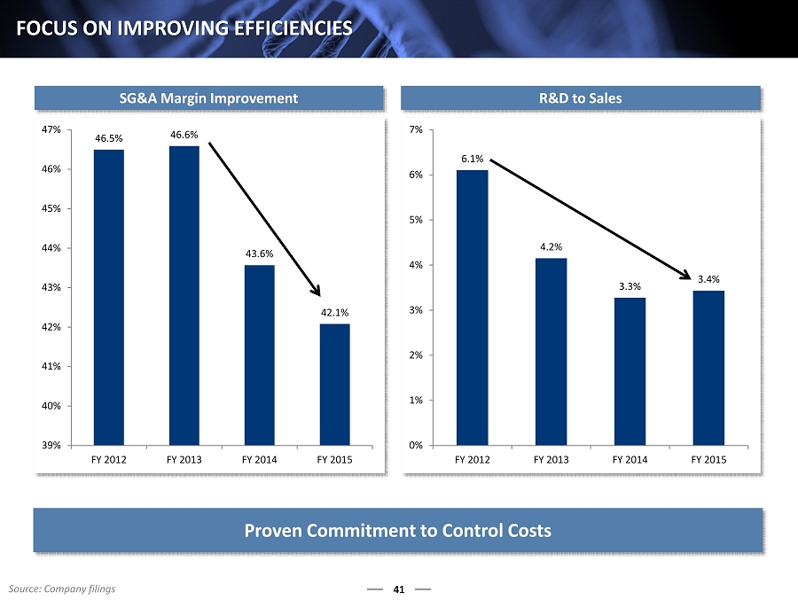 6.1% 4.2% 3.3% 3.4% 0% 1% 2% 3% 4% 5% 6% 7% FY 2012 FY 2013 FY 2014 FY 2015 46.5% 46.6% 43.6% 42.1% 39% 40% 41% 42% 43% 44% 45% 46% 47% FY 2012 FY 2013 FY 2014 FY 2015 41 FOCUS ON IMPROVING EFFICIENCIES SG&A Margin Improvement R&D to Sales Proven C ommitment to Control Costs Source: Company filings