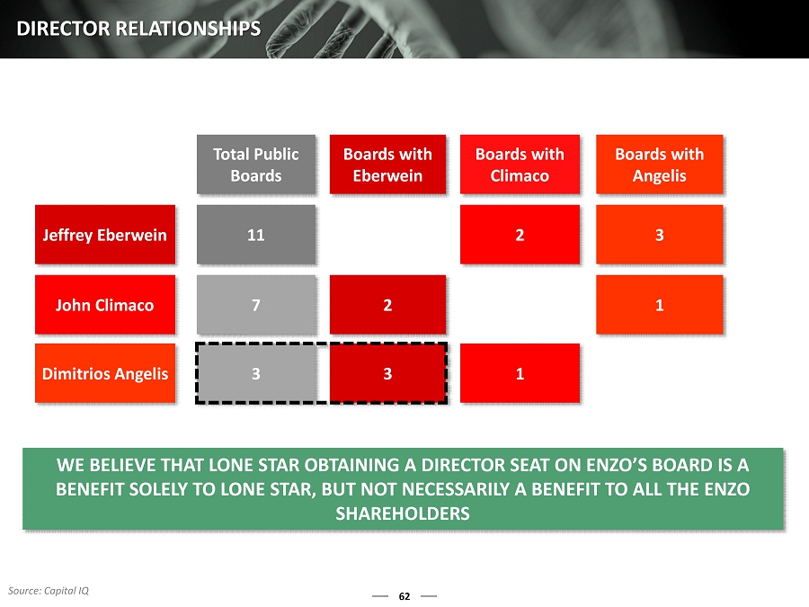 62 DIRECTOR RELATIONSHIPS WE BELIEVE THAT LONE STAR OBTAINING A DIRECTOR SEAT ON ENZO’S BO ARD IS A BENEFIT SOLELY TO LONE STAR, BUT NOT NECESSARILY A BENEFIT TO AL L THE ENZO SHAREHOLDERS Total Public Boards Boards with Eberwein Boards with Climaco Boards with Angelis Jeffrey Eberwein 11 2 3 John Climaco 7 2 1 Dimitrios Angelis 3 3 1 Source: Capital IQ