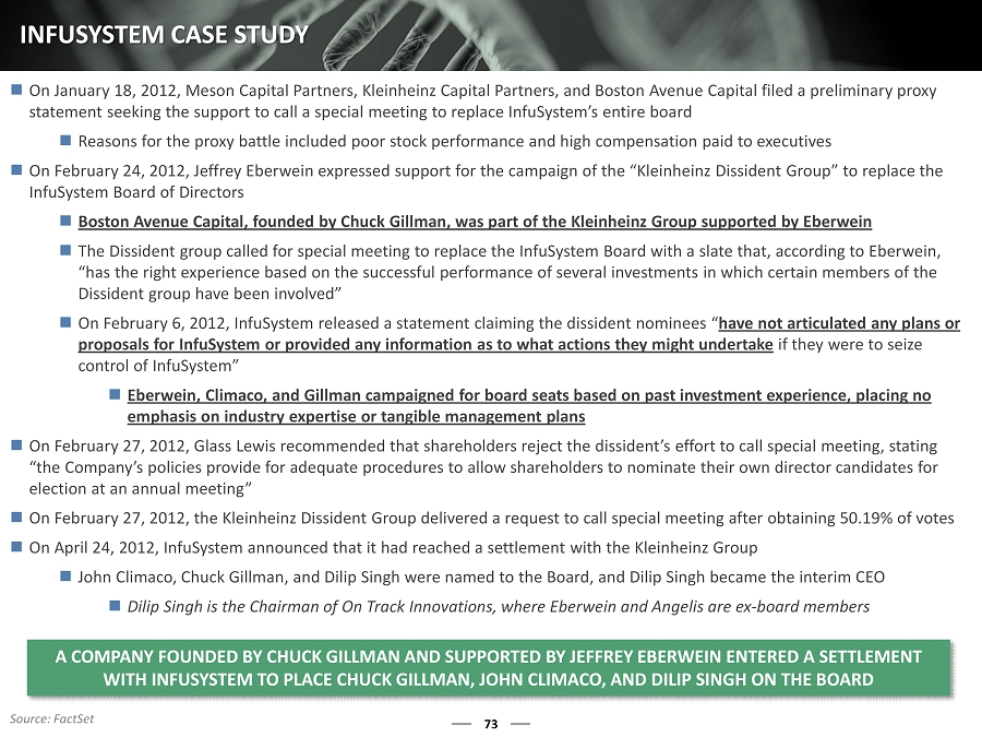 73 INFUSYSTEM CASE STUDY A COMPANY FOUNDED BY CHUCK GILLMAN AND SUPPORTED BY JEFFREY EBER WEIN ENTERED A SETTLEMENT WITH INFUSYSTEM TO PLACE CHUCK GILLMAN, JOHN CLIMACO, AND DILIP SINGH ON THE BOARD On January 18, 2012, Meson Capital Partners, Kleinheinz Capital Partners, and Boston Avenue Capital filed a preliminary proxy statement seeking the support to call a special meeting to replace InfuSystem’s entire board Reasons for the proxy battle included poor stock performance and high compensation paid to executives On February 24, 2012, Jeffrey Eberwein expressed support for the campaign of the “Kleinheinz Dissident Group” to replace the InfuSystem Board of Directors Boston Avenue Capital, founded by Chuck Gillman, was part of the Kleinheinz Group supported by Eberwein The Dissident group called for special meeting to replace the InfuSystem Board with a slate that, according to Eberwein, “has the right experience based on the successful performance of several investments in which certain members of the Dissident group have been involved” On February 6, 2012, InfuSystem released a statement claiming the dissident nominees “ have not articulated any plans or proposals for InfuSystem or provided any information as to what actions they might undertake if they were to seize control of InfuSystem” Eberwein, Climaco, and Gillman campaigned for board seats based on past investment experience, placing no emphasis on industry expertise or tangible management plans On February 27, 2012, Glass Lewis recommended that shareholders reject the dissident’s effort to call special meeting, statin g “the Company’s policies provide for adequate procedures to allow shareholders to nominate their own director candidates for election at an annual meeting ” On February 27, 2012, the Kleinheinz Dissident Group delivered a request to call special meeting after obtaining 50.19% of vo tes On April 24, 2012, InfuSystem announced that it had reached a settlement with the Kleinheinz Group John Climaco, Chuck Gillman, and Dilip Singh were named to the B oard, and Dilip Singh became the interim CEO Dilip Singh is the Chairman of On Track Innovations, where Eberwein and Angelis are ex - board members Source: FactSet