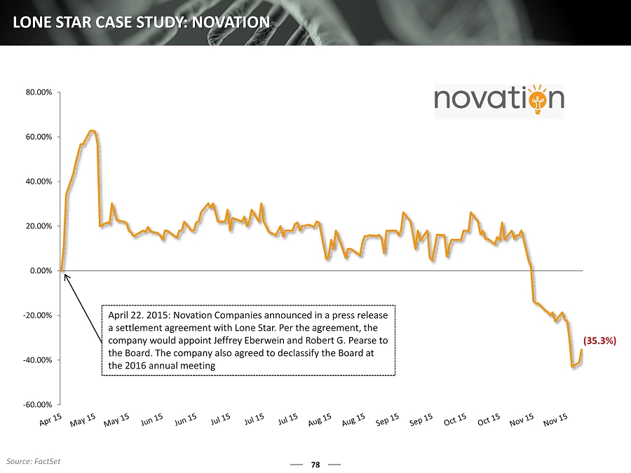 78 LONE STAR CASE STUDY: NOVATION -60.00% -40.00% -20.00% 0.00% 20.00% 40.00% 60.00% 80.00% April 22. 2015: Novation Companies announced in a press release a settlement agreement with Lone Star. Per the agreement, the company would appoint Jeffrey Eberwein and Robert G. Pearse to the Board. The company also agreed to declassify the Board at the 2016 annual meeting (35.3%) Source: FactSet